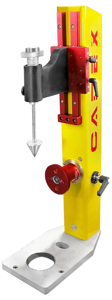 The Cadex mechanical resistance of visors jig is designed and manufactured to test mechanical characteristics of motorcycle visors as per ECE 22, section 7.8.2. Once installed on either a monorail or twinwire machine, a drop hammer of 3 kg falls on the linear punch. Test technician can then take advantage of a guided drop & motorization function of existing standard impact machines.